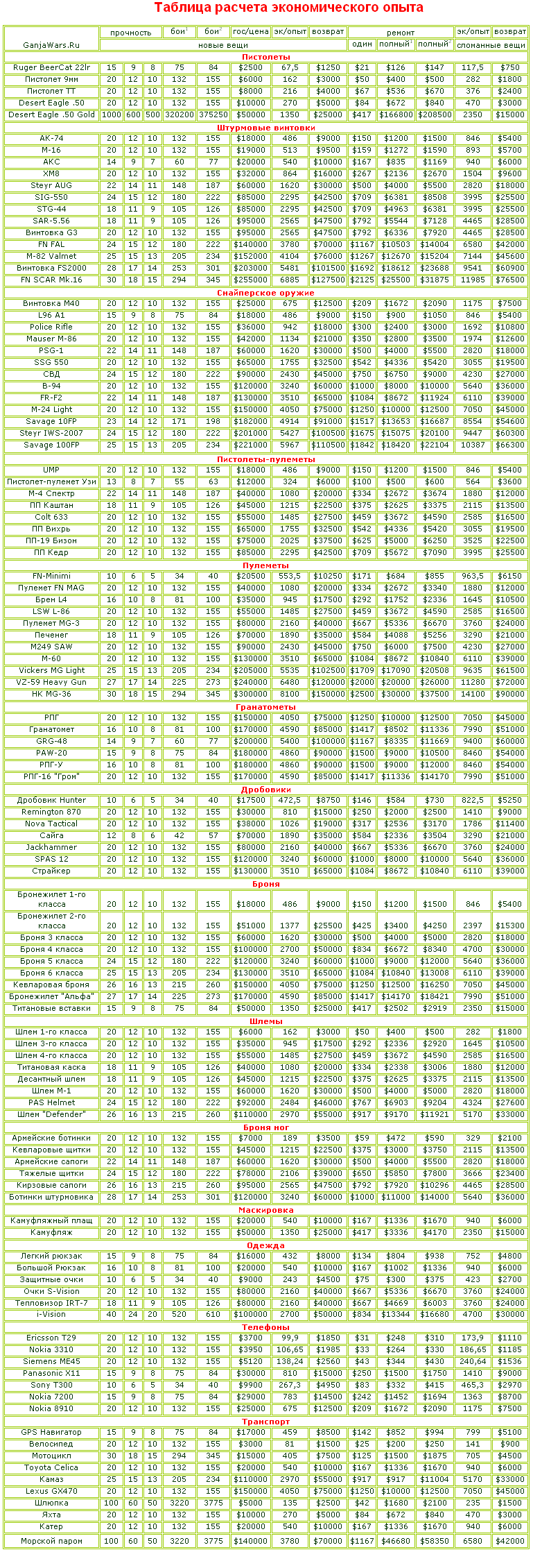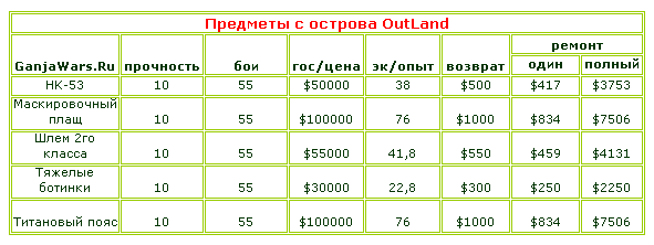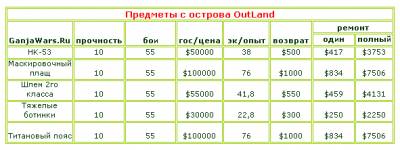 ☼ экономический опыт, получаемый с предметов с острова OutLand фиксированный и не меняется с изменением их прочности, также не меняется возврат при сдаче предметов в государственный магазин, и составляет 1% от стоимости