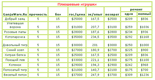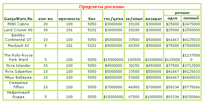 ☼ для транспорта в графе "бои" указанные данные действительны при условии возможности поломок этих предметов в боях